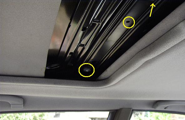 Next, with a torx wrench (T-20, I think) remove the torx screws that are located on the inside of the roof panel, near the front. These are a pain to get back in there once you are all done, you just have to work at it for a bit.