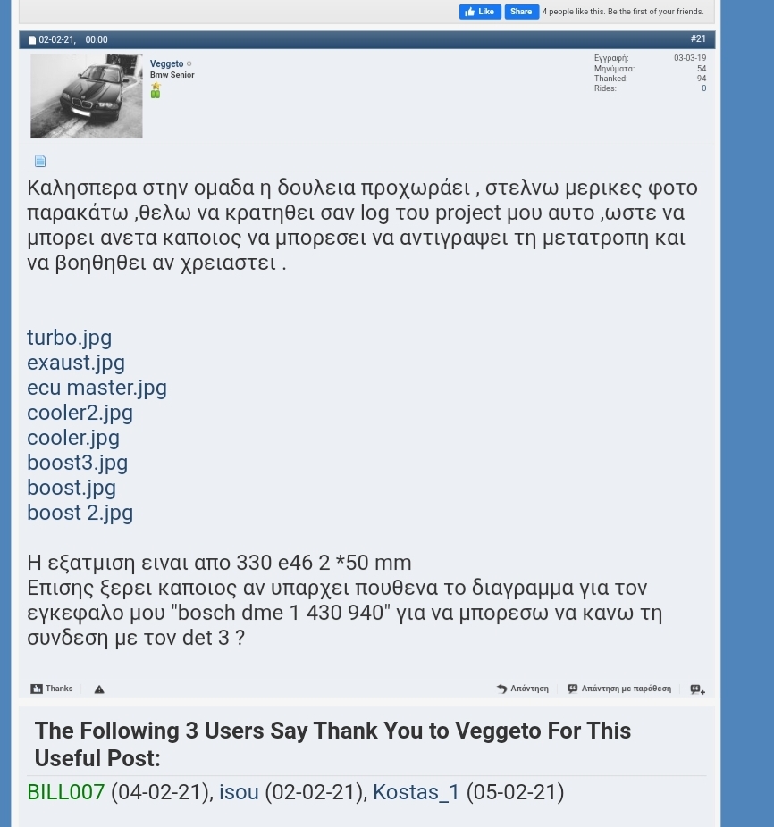 4 μηνες πλεον turbo το bmw εχω κανει 5000 km χωρις κανενα προβλημα ,να πω οτι οι αλλαγες που εχουν γινει ειναι maf απο s3 πιεση 0.7 με 0.5 απο τις 5800 και μετα και ρυθμιση του μαμα εγκεφαλου ,οπως επισης και εξαφτερο δισκο ,το αμαξι εχει φαει πολυ σκισιμο και δεν εχει κανει κιχ μεχρι τωρα ,η επομενη κινηση ειναι να γυρισω σε fuel stand alone τον det3 γιατι ο bms46 καπου εδω τελειωνει ...