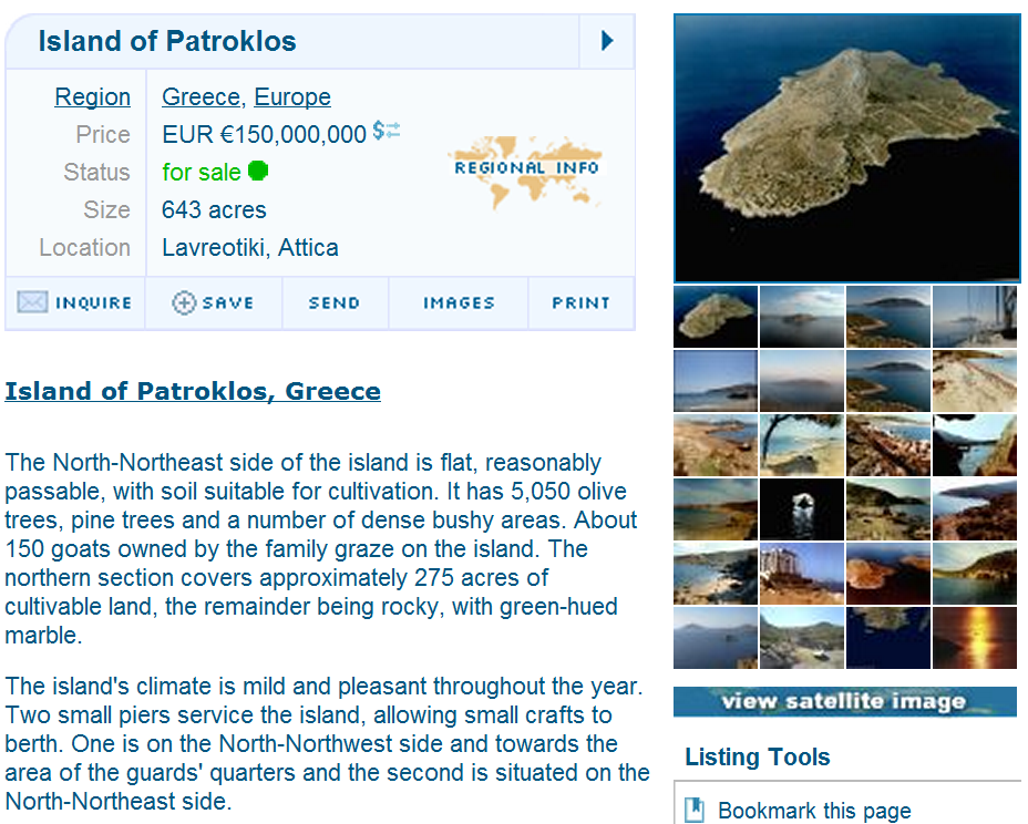 Κάπως έτσι, αγγελία που έχει αναρτηθεί σε καναδική ιστοσελίδα, βάζει πωλητήριο στο περίφημο νησάκι Πάτροκλος. Η αγγελία πώλησής του βάζει ως τιμή εκκίνησης τα 150 εκατ. δολάρια, αν και μια σειρά υποψήφιων επενδυτικών σχεδίων που είδαν το φως της δημοσιότητας την τελευταία 10ετία, έδειχναν ότι οι ιδιοκτήτες του νησιού συζητούν μια τιμή κοντά στα 120 εκατ. δολάρια.